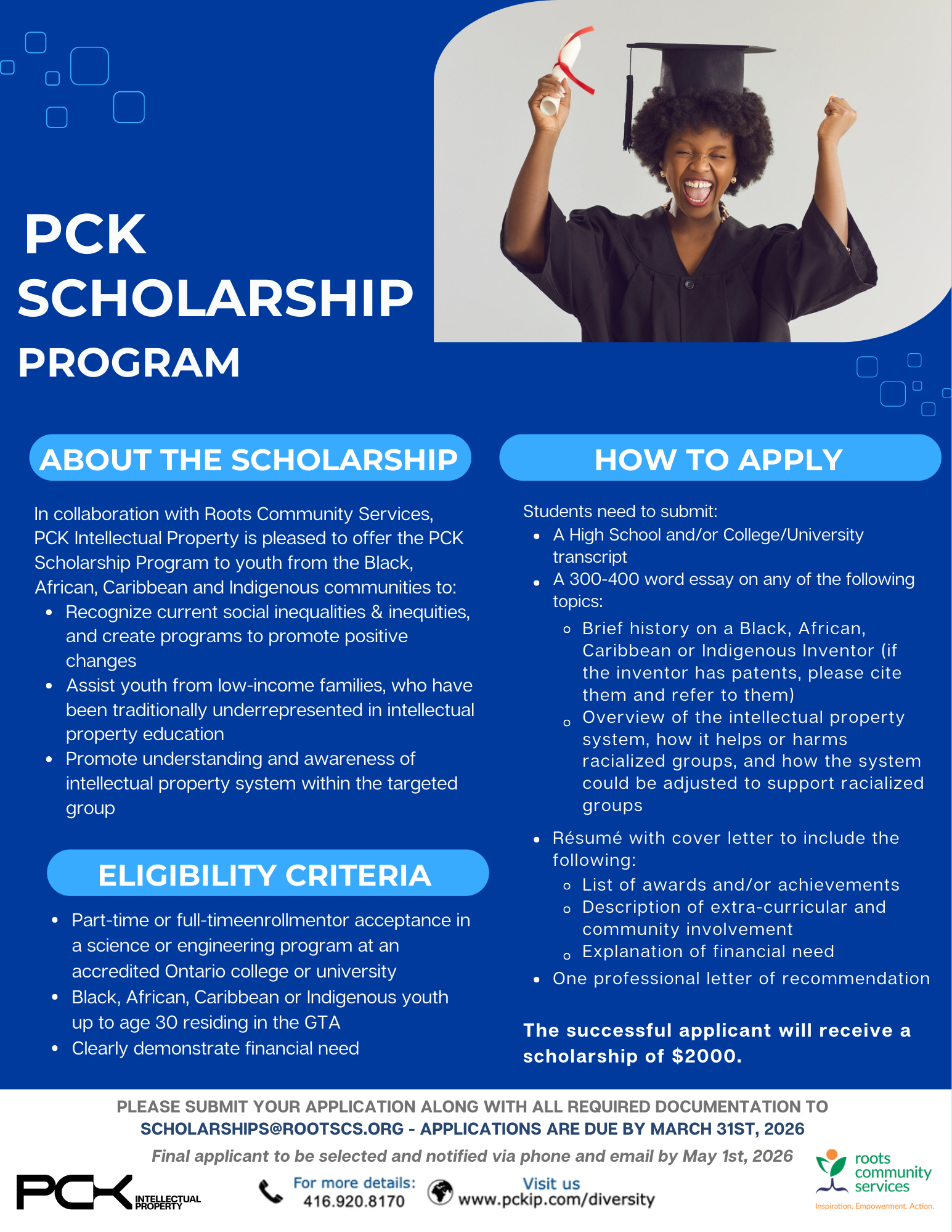 Applications must be submitted to scholarships@rootscs.org no later than March 31, 2026. The selected applicant will be notified by phone and email by May 1, 2026.